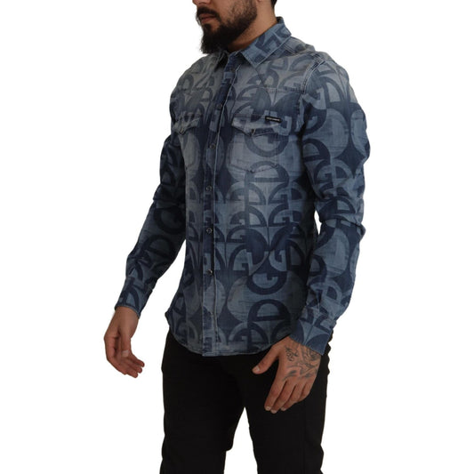 Dolce & Gabbana Blue Denim Stretch DG Crown Logo Casual Shirt
