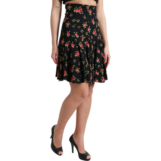Dolce & Gabbana Black Rose High Waist A-line Knee Length Skirt